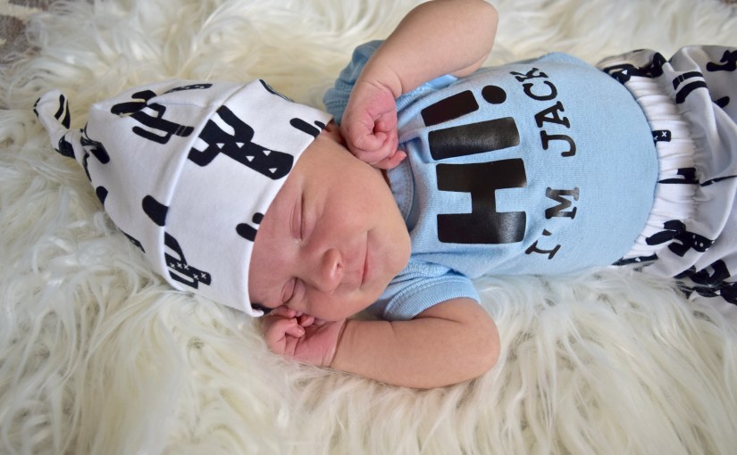 I’m in love with this onesie from Jam Threads! I love just about anything with his name on it, but I love how it’s more than just his name monogrammed. The saying is so perfect for newborns. I also just love this color of blue on him! The hat and pants are from BambooSwaddles4Baby and I can’t get enough of the geometric cacti. All of the prints they have are so different and unique; plus I love supporting small businesses!