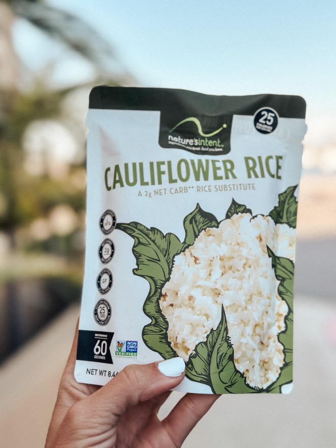 When I’m in need of a quick lunch or dinner I will make this Cauliflower Rice from Nature’s Intent. It microwaves in 60 seconds and only has 2 net carbs. This is a GREAT rice substitute!!