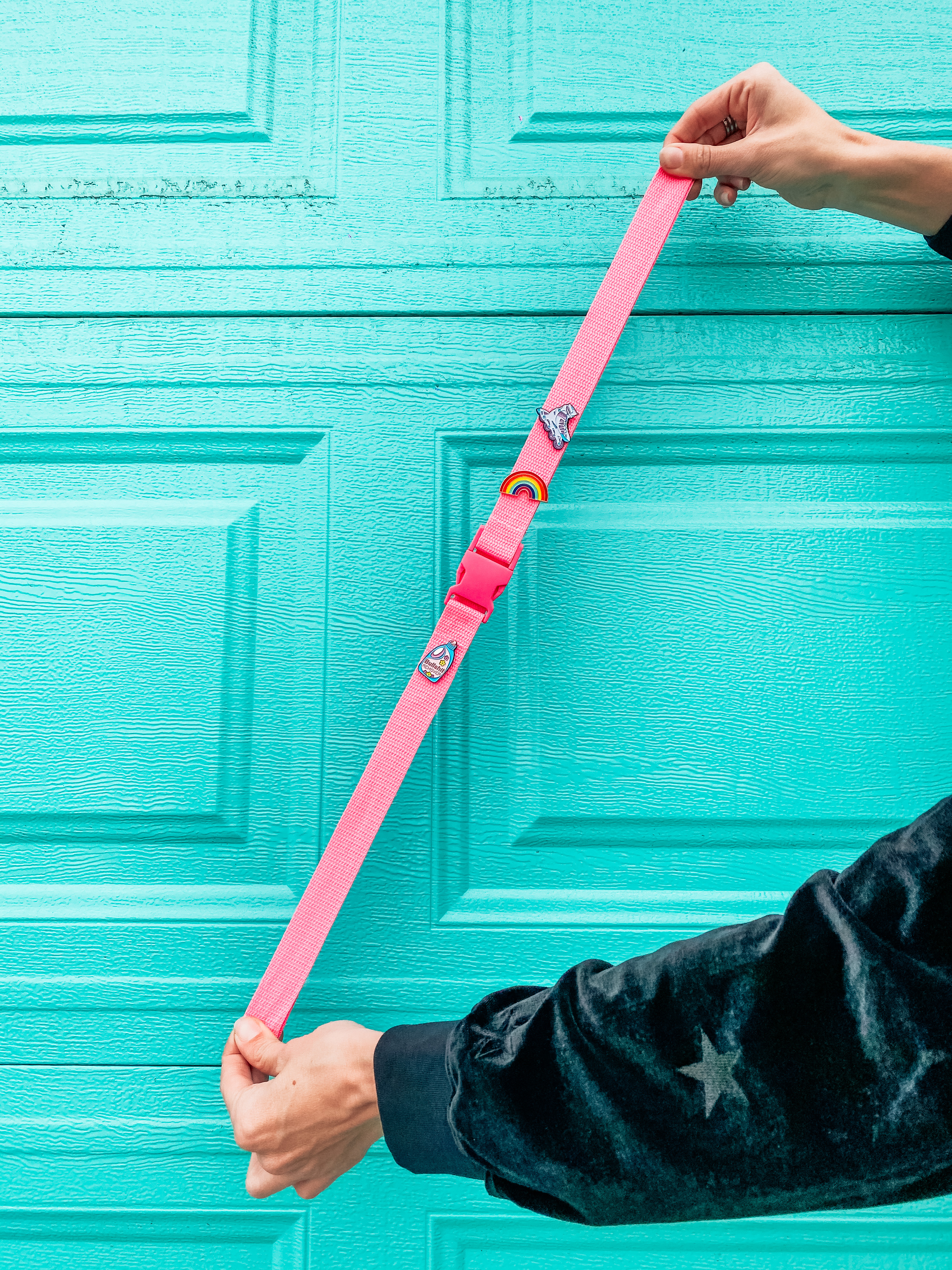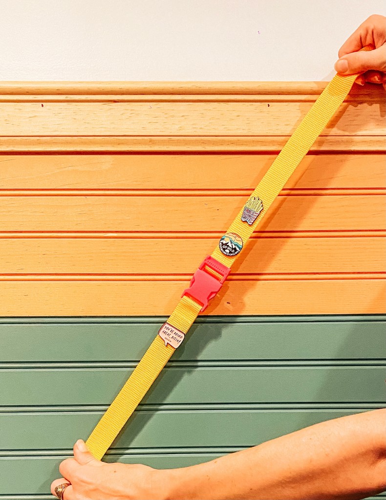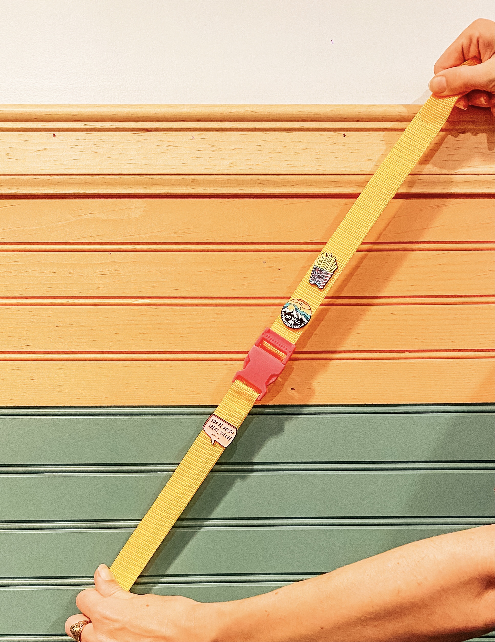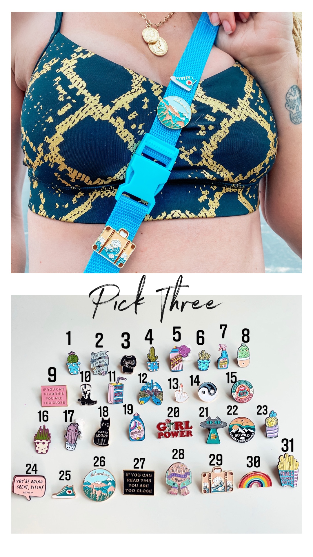 Handmade in Southern California. The strap is 1 inch wide and 36 inches long. FREE US SHIPPING. 3 pins of your choice from the image above. I will email you once I receive your purchase to ask which pins you would like. If I do not receive a reply within 48 hours, I will select 3 for you. These pins are high quality and super cute!