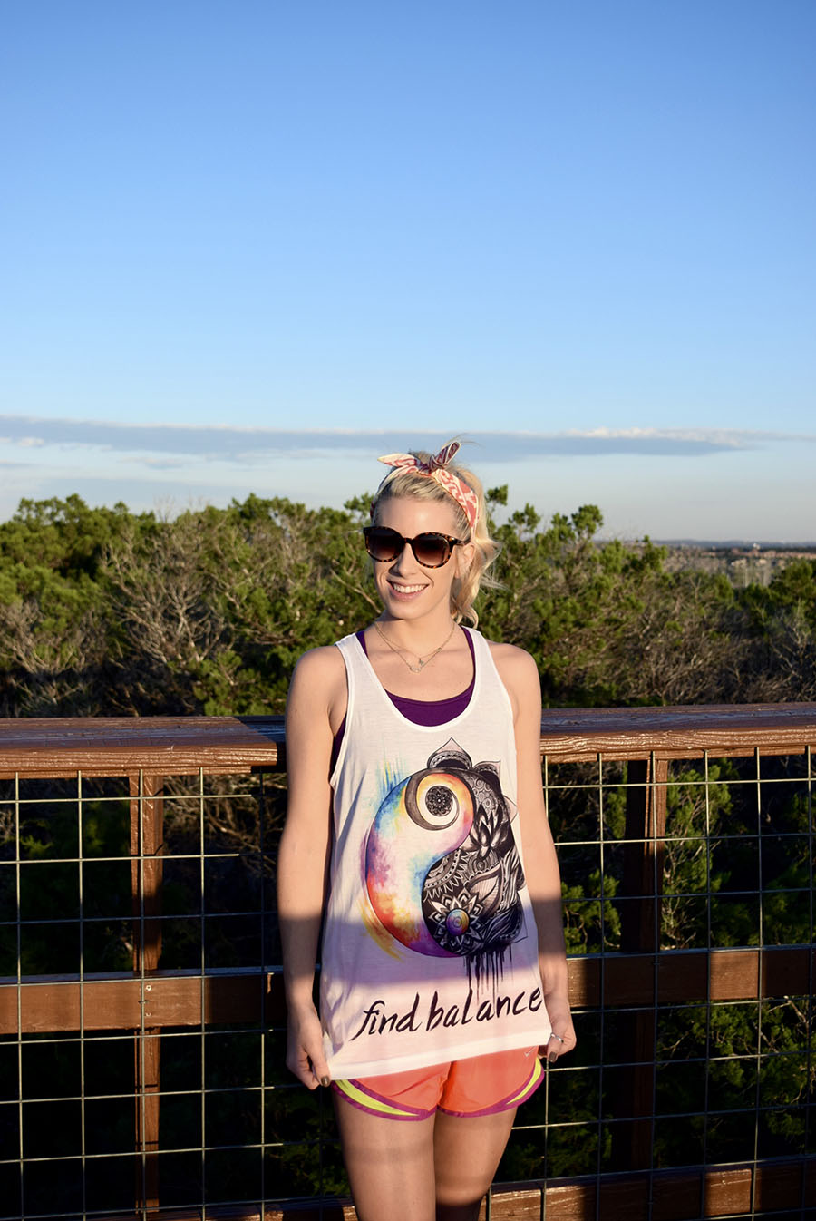 There is also a wooden lookout deck that gives you an awesome elevated view of San Antonio, including the downtown area. The hill that leads you up to the post is pretty steep, so I like doing lunges on the way for a little extra workout! The tank top I’m wearing is from one of my favorite companys called Electro Threads and I absolutely love it. All of their designs are colorfully unique and spread a positive message. Finding balance is something I’m trying to do daily in my life & I love wearing this tank as a reminder! ❤